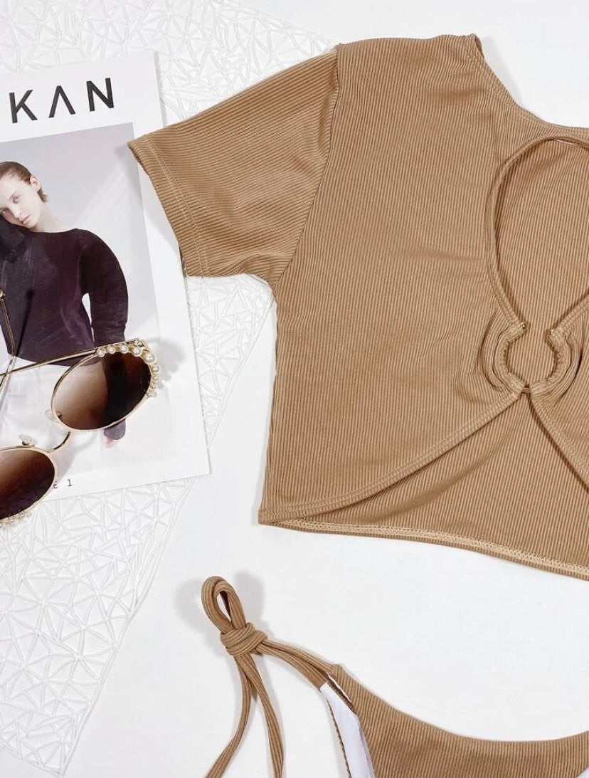 Two piece set. Short sleeve shirt swim top with gold ring. Bikini bottom side tie strings.